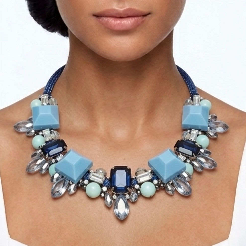 Add a touch of elegance to your look with our 2059 necklace. This exquisite hand-embroidered macramé necklace is embellished with crystals and Swarovski crystals in various shades of green. It pairs easily with an elegant dress for a refined look or with a more casual outfit for a touch of style. The lobster clasp and chain make it easy to wear and adjustable, ensuring comfort and practicality without sacrificing elegance. Add a touch of style to your look with this stunning necklace.